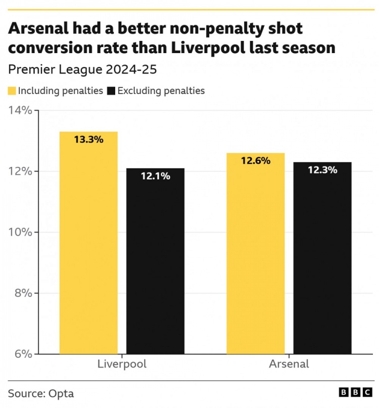 上赛季阿森纳的非点球破门效率比利物浦更高