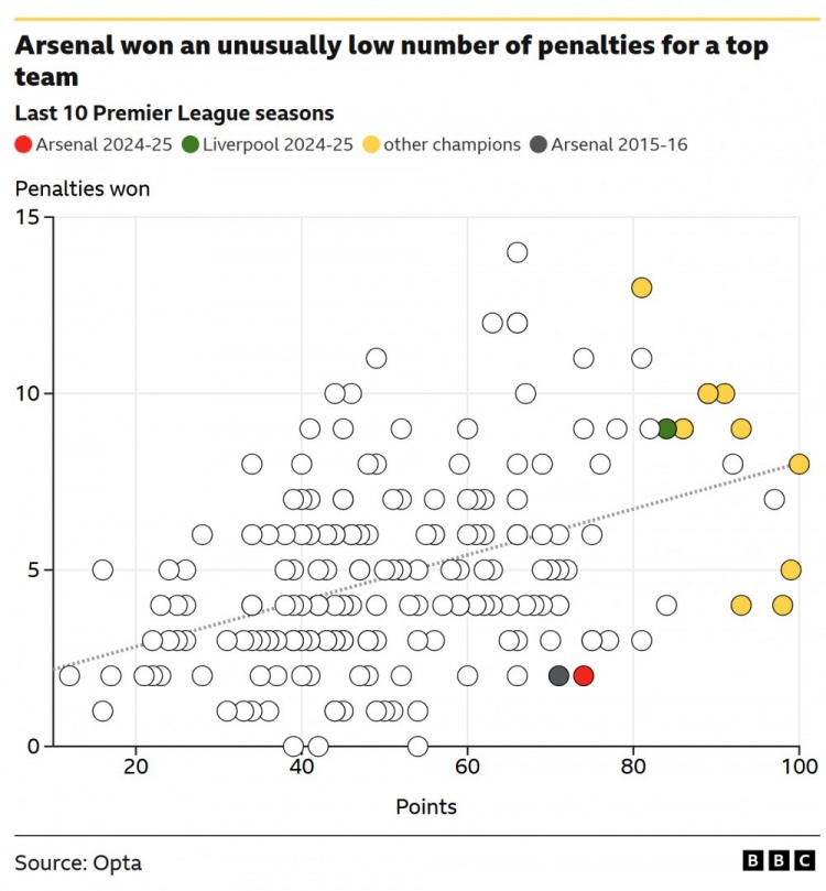 虽然利物浦的9个点球不少,但过去十年有14支球队单季拿得更多。比如19/20赛季的曼联,38场就捞了14个点球!但像阿森纳这种争冠级别的球队只拿2个点球,太反常了。过去10年,积分70多分的队伍平均能拿5个点球,冠军队伍平均能拿8个。