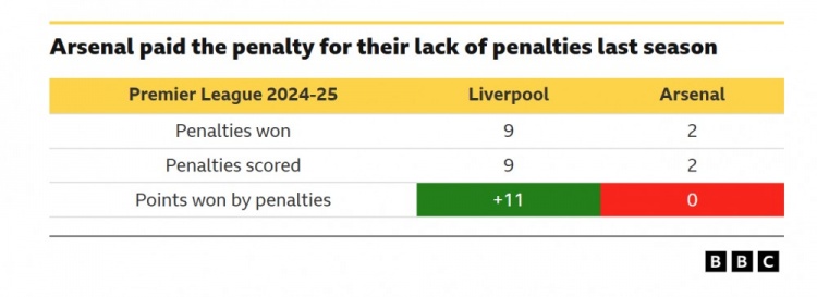 上赛季利物浦因为点球而多拿了11分,相较之下阿森纳没有因为点球抢到额外的积分