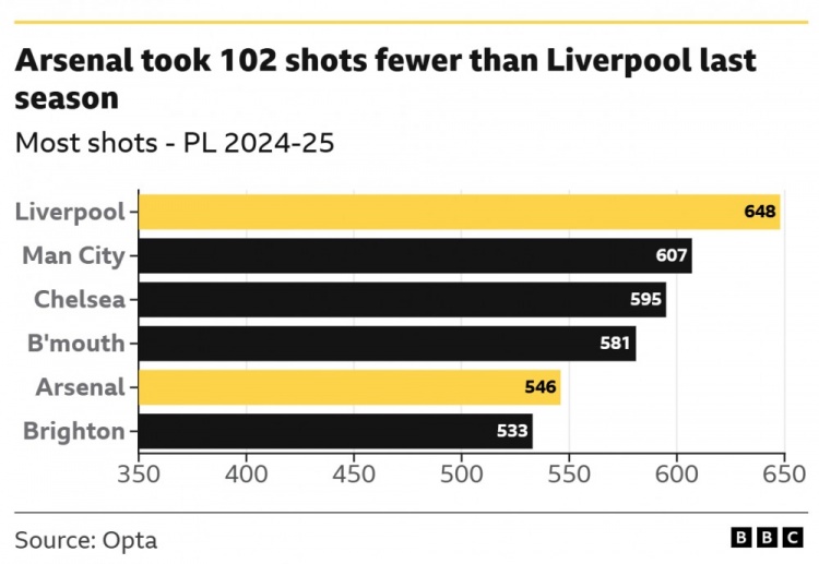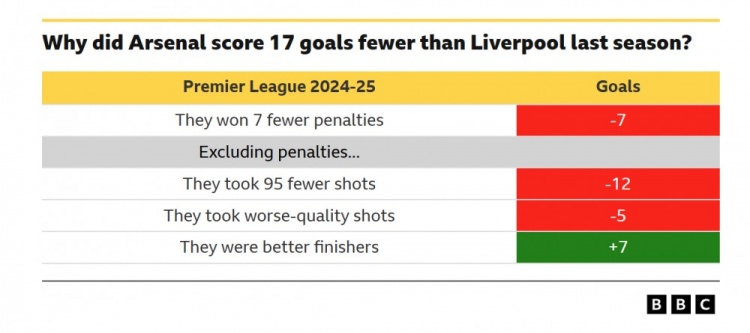 上赛季阿森纳点球比利物浦少7次,非点球射门少95(少了12球),射门质量也要差一些