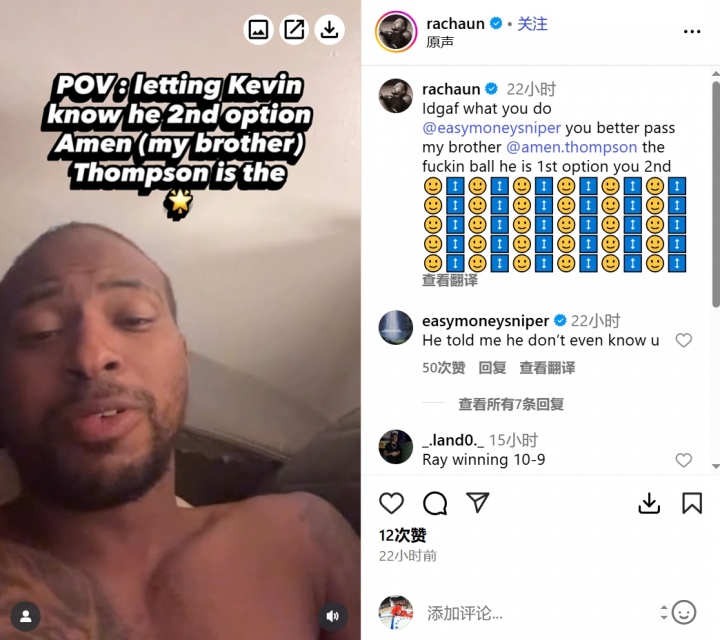 Rachaun配文称:“@KD我不管你是谁,赶紧把那该死的球传给@阿门,他才是球队核心,你只能排第二。🙂”